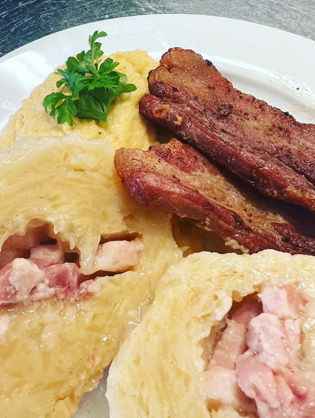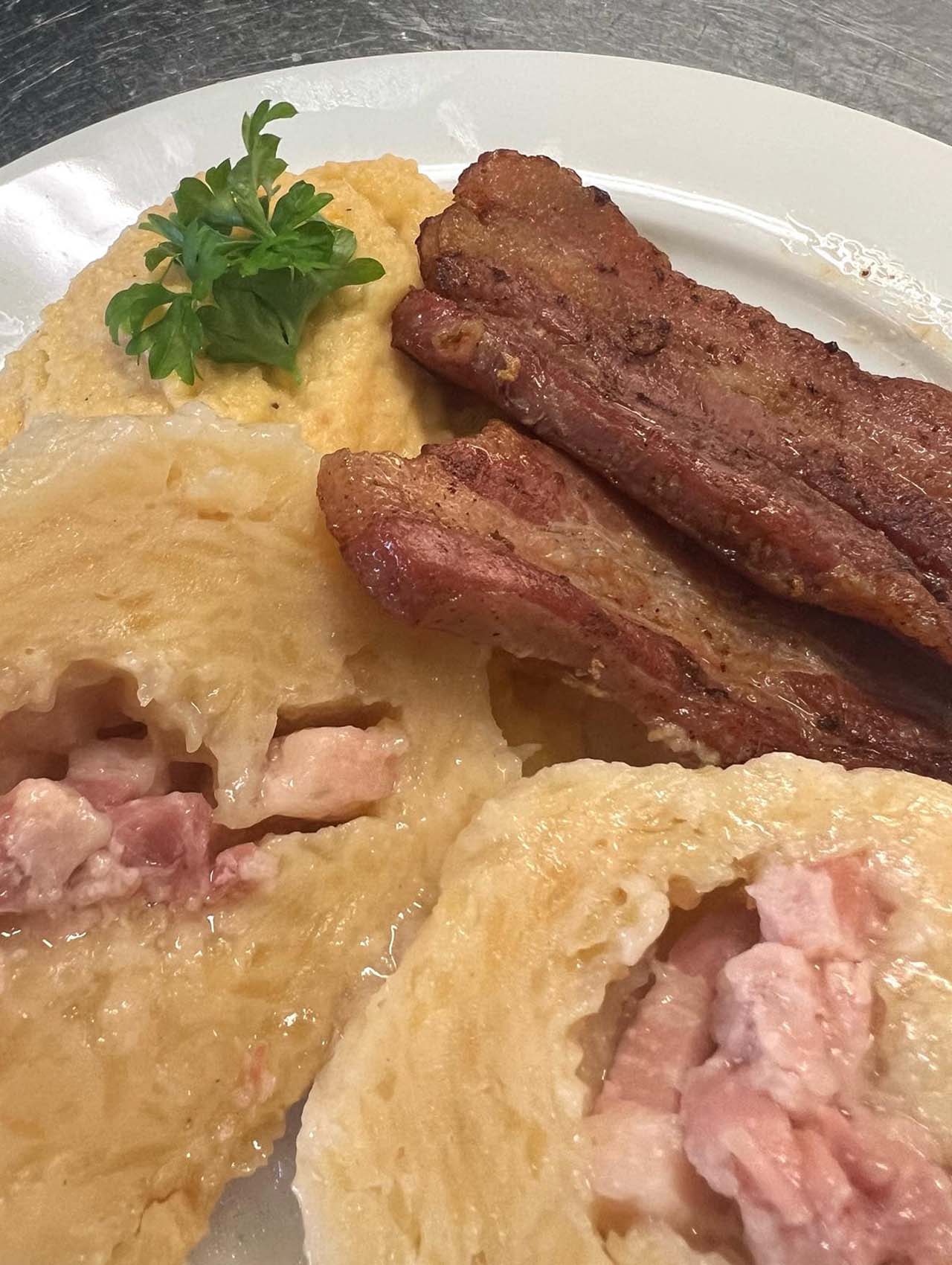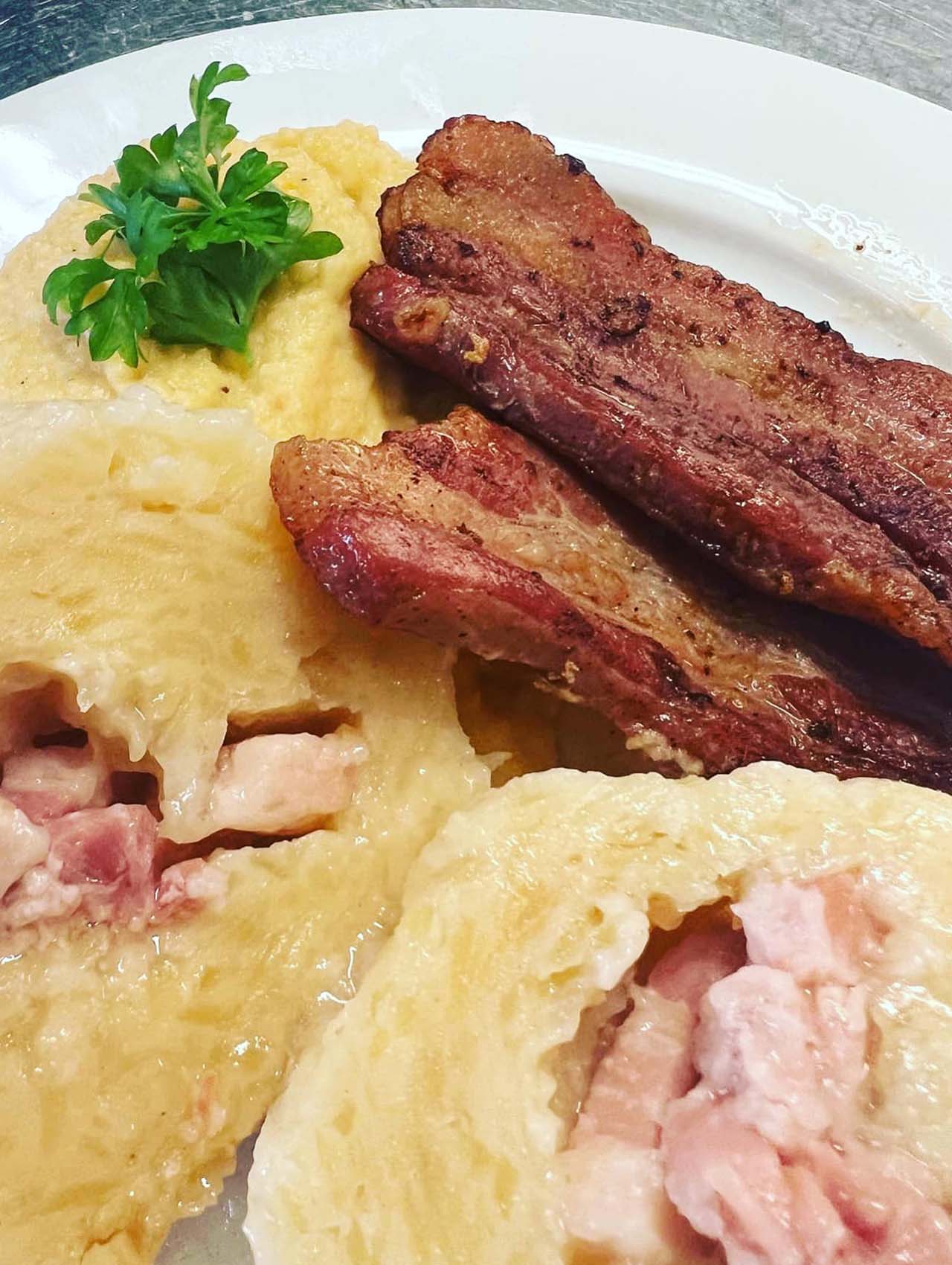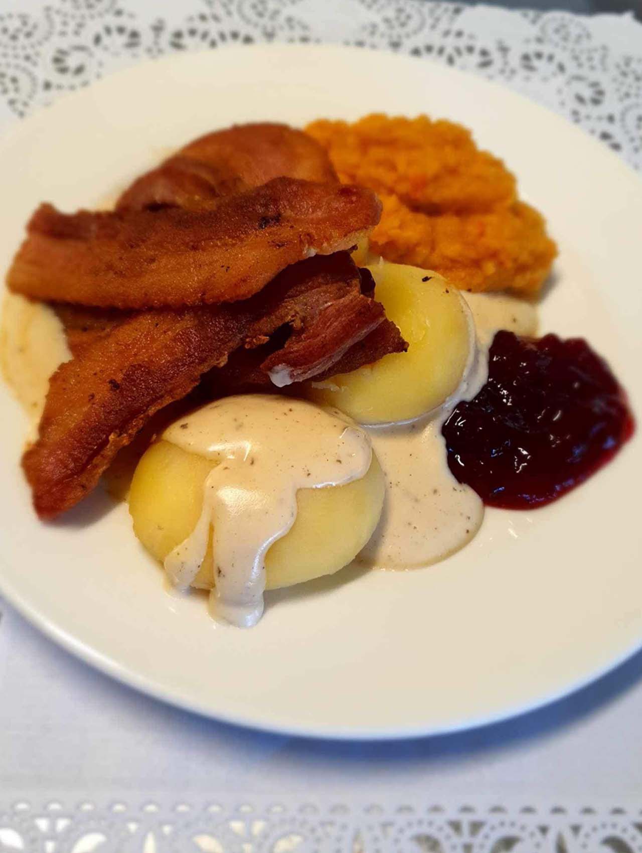 Potetklubb med kålrotstappe og stekt flesk kr 195,– Liten kr 165,-
