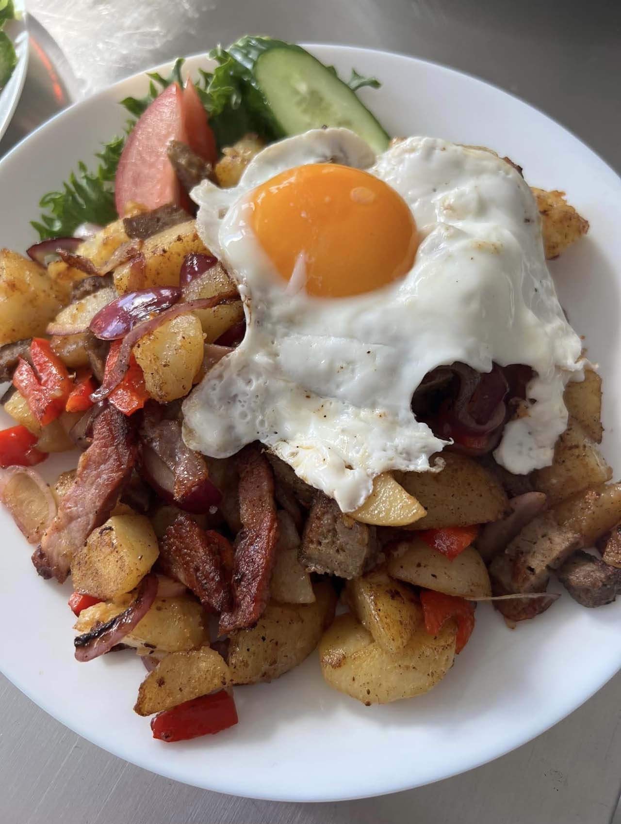 - Sjåførlunsj med stekte poteter, bacon, egg og brød kr 129,-