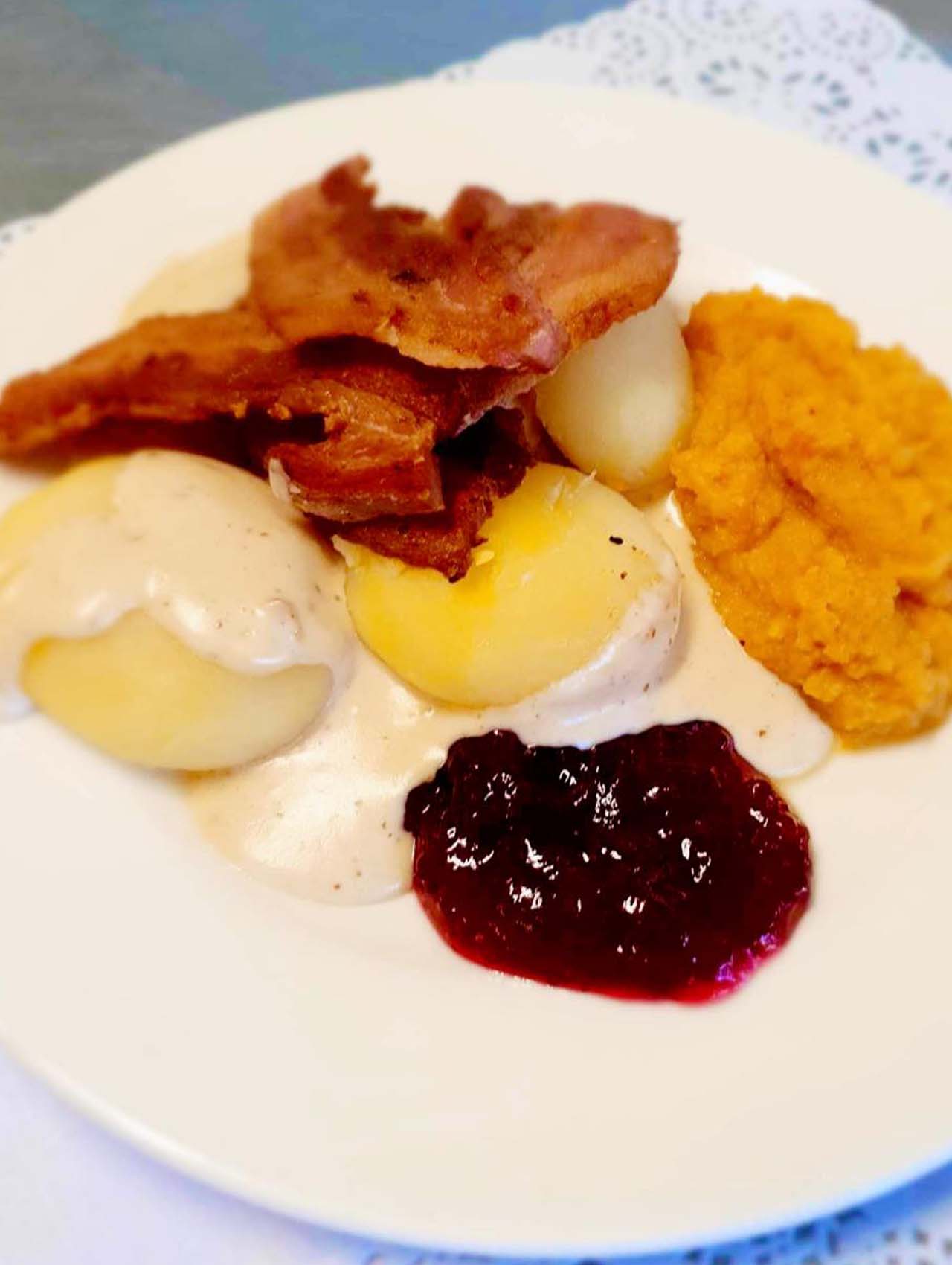 Flesk og duppe med kålrotstappe kr 195,- stor kr 215,-