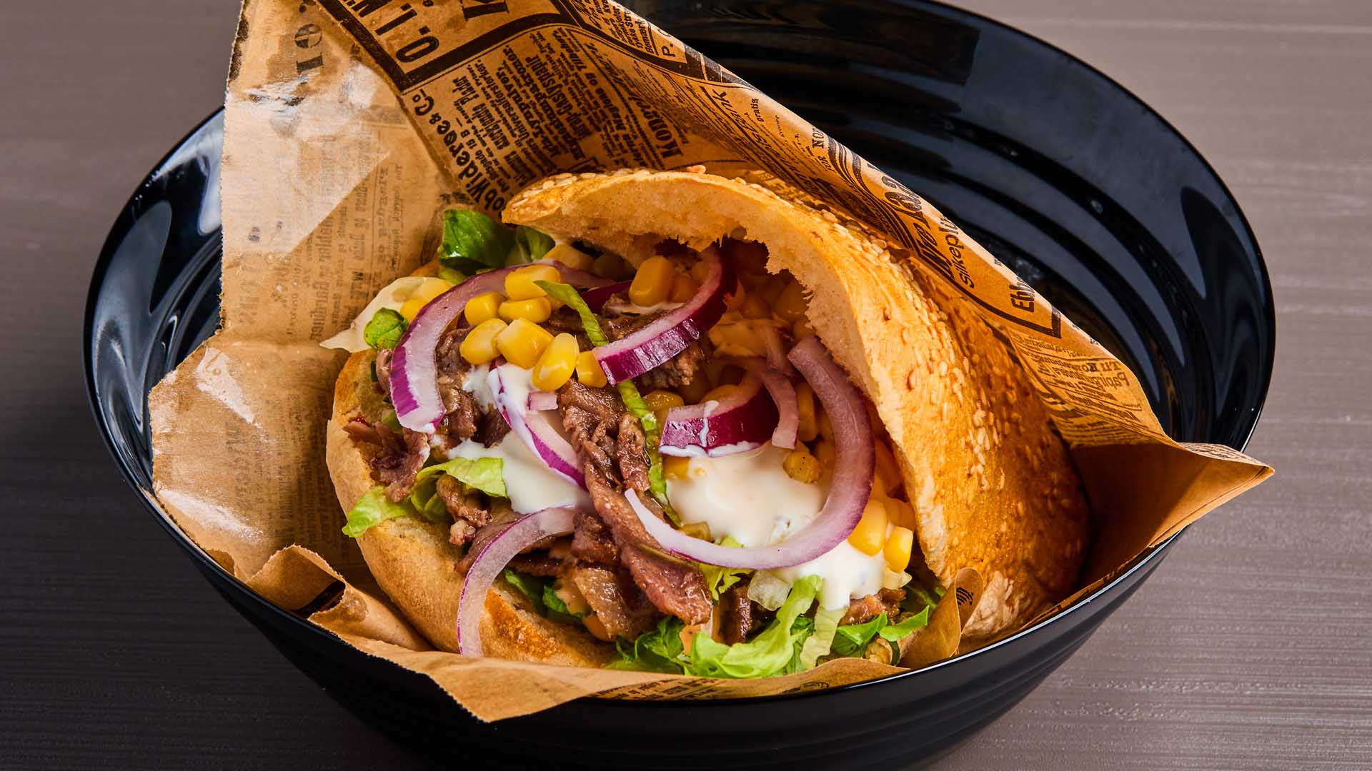 - Roastbiff med remulade, sylteagurk, løk kr 49,-